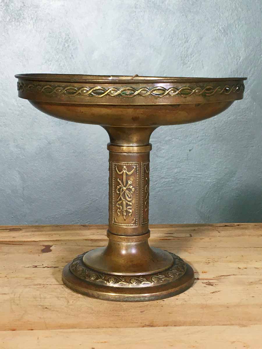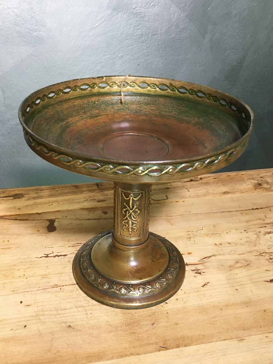 Antica alzata Liberty in metallo brunito con decori sbalzati. Discrete condizioni anche se non è perfetta visto il normale utilizzo e il tempo trascorso. Oggetto bellissimo per decoro e realizzazioni, ideale come centro tavola, alzata o porta pianta, comunque un ottimo elemento di decoro e di eleganza.