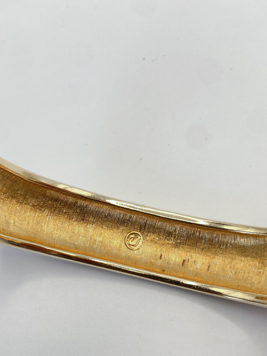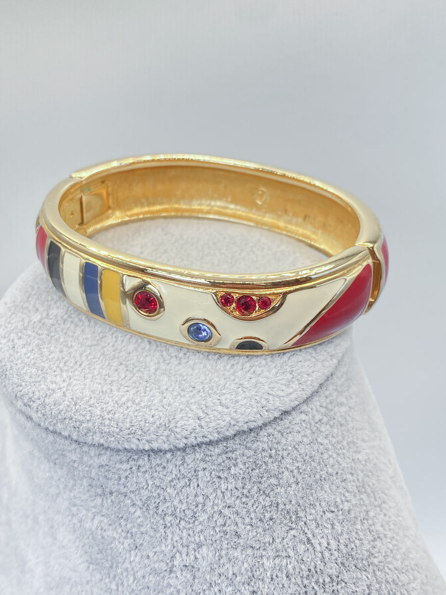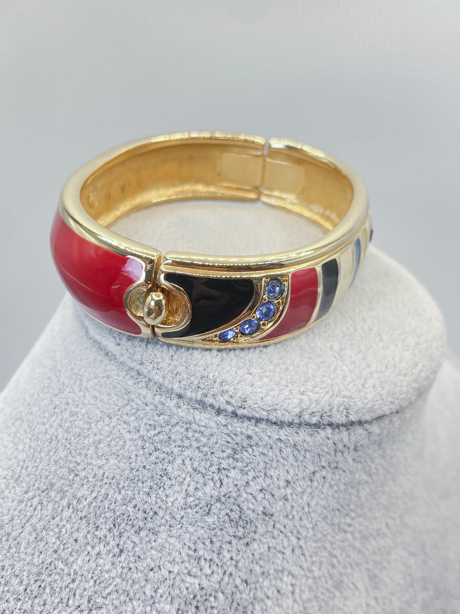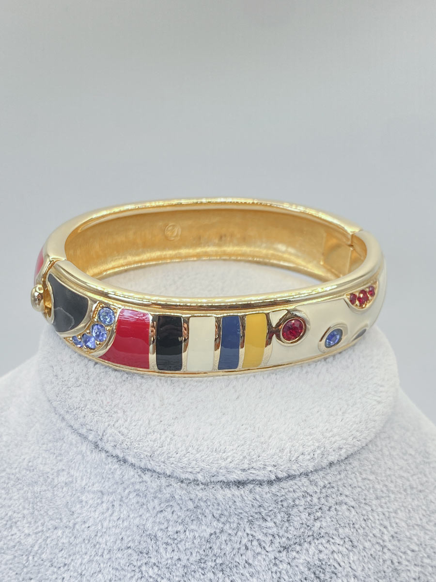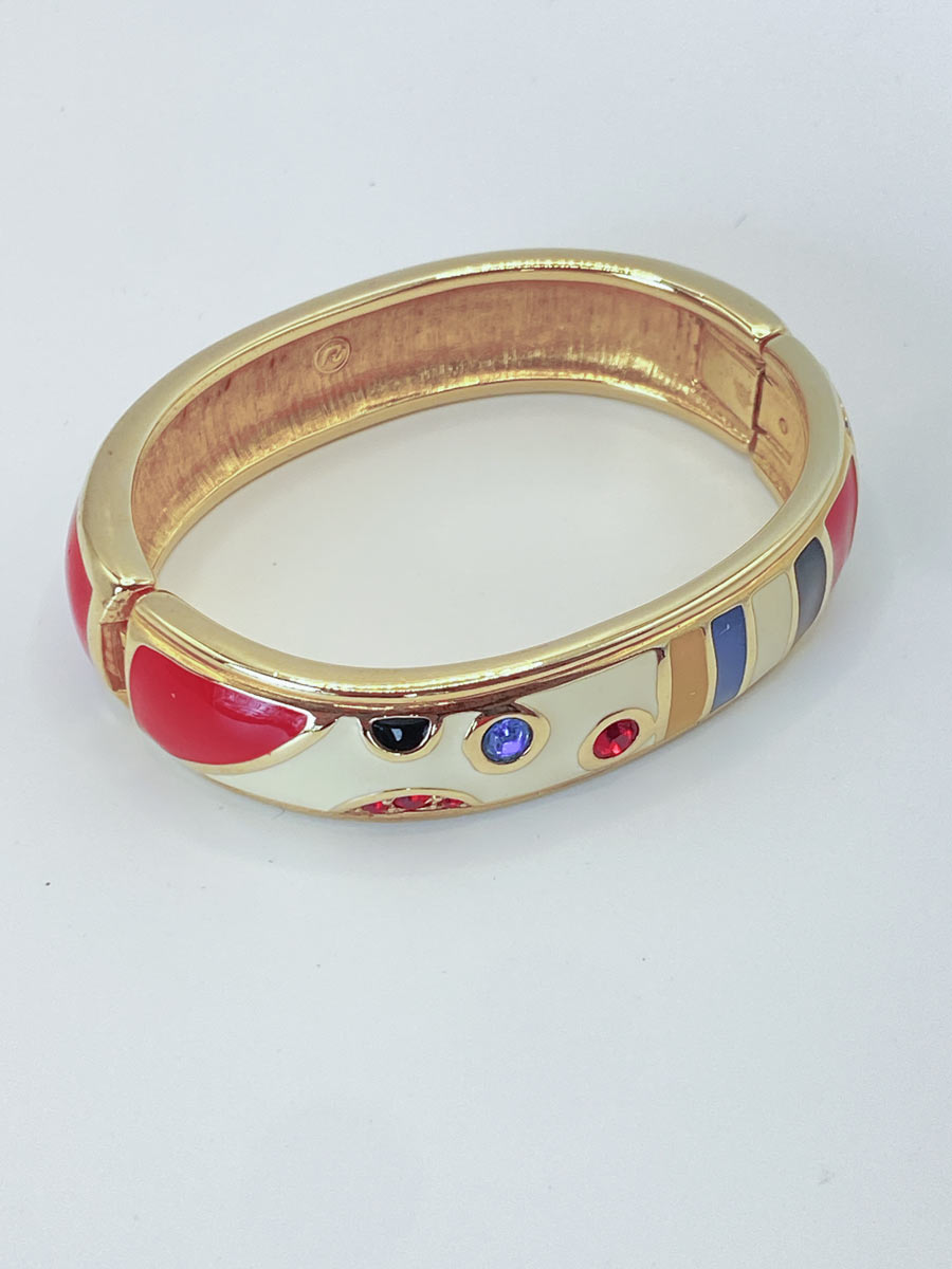 Originale bracciale rigido Swarovski con finitura dorata, decorazioni in smalto nei toni del rosso, blu e bianco e dettagli impreziositi da cristalli luminosi