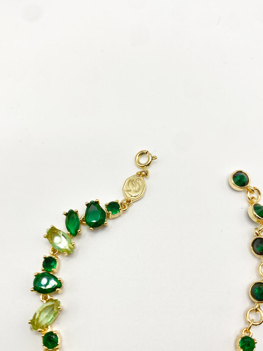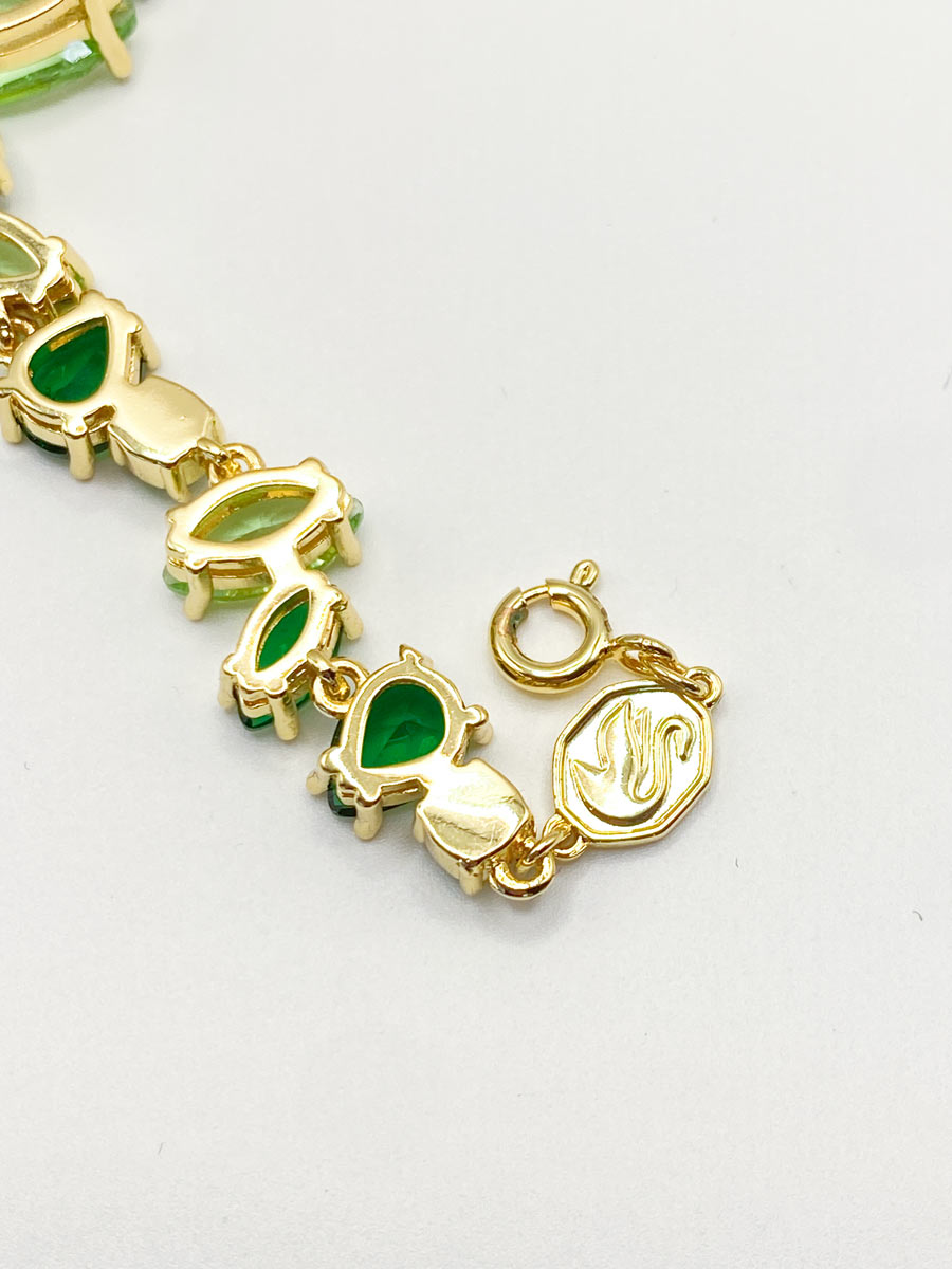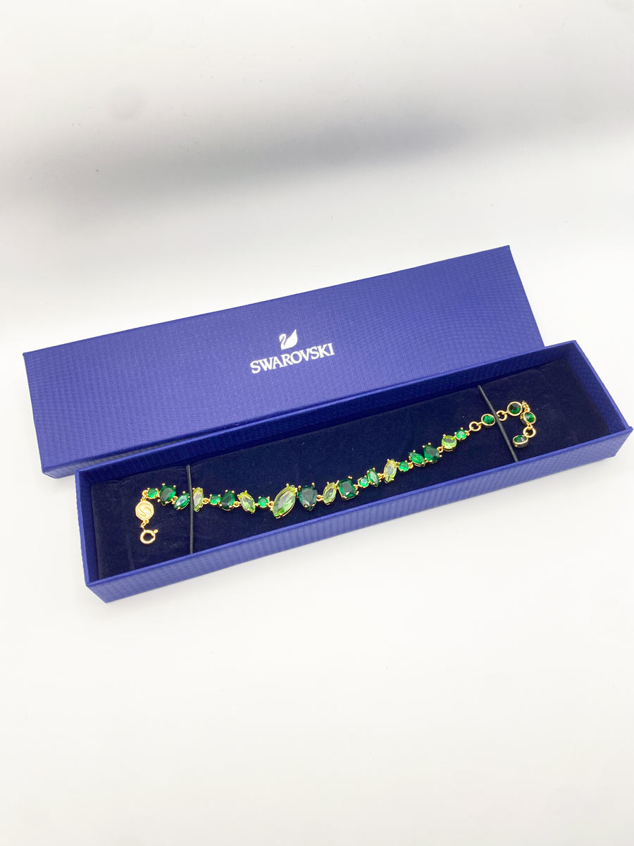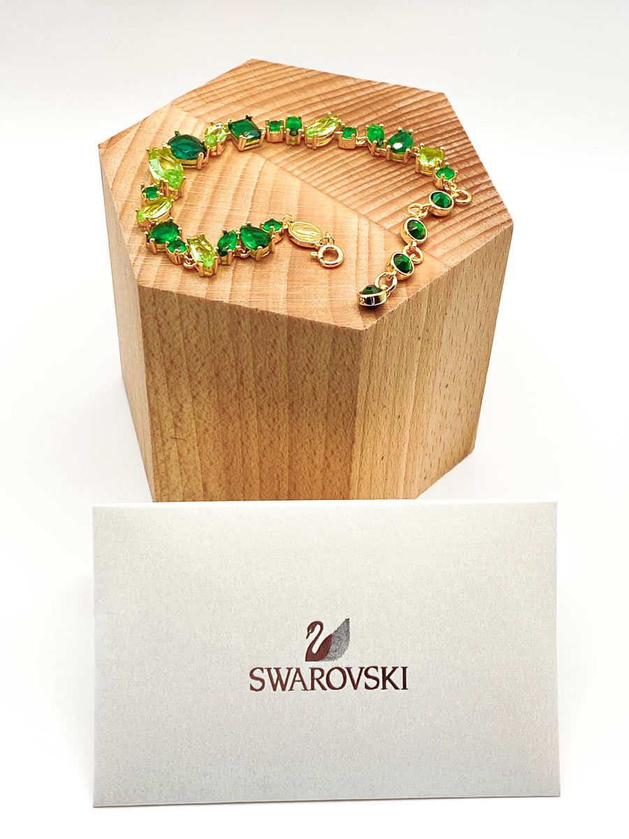 Bracciale Swarovski della collezione Gema, verde taglio misto, nuovo mai indossato, completo di scatola originale. Un gioiello raggiante e di una colorazione bellissima, con tagli misti e sfumature di verse. Presente il classico logo del cigno.