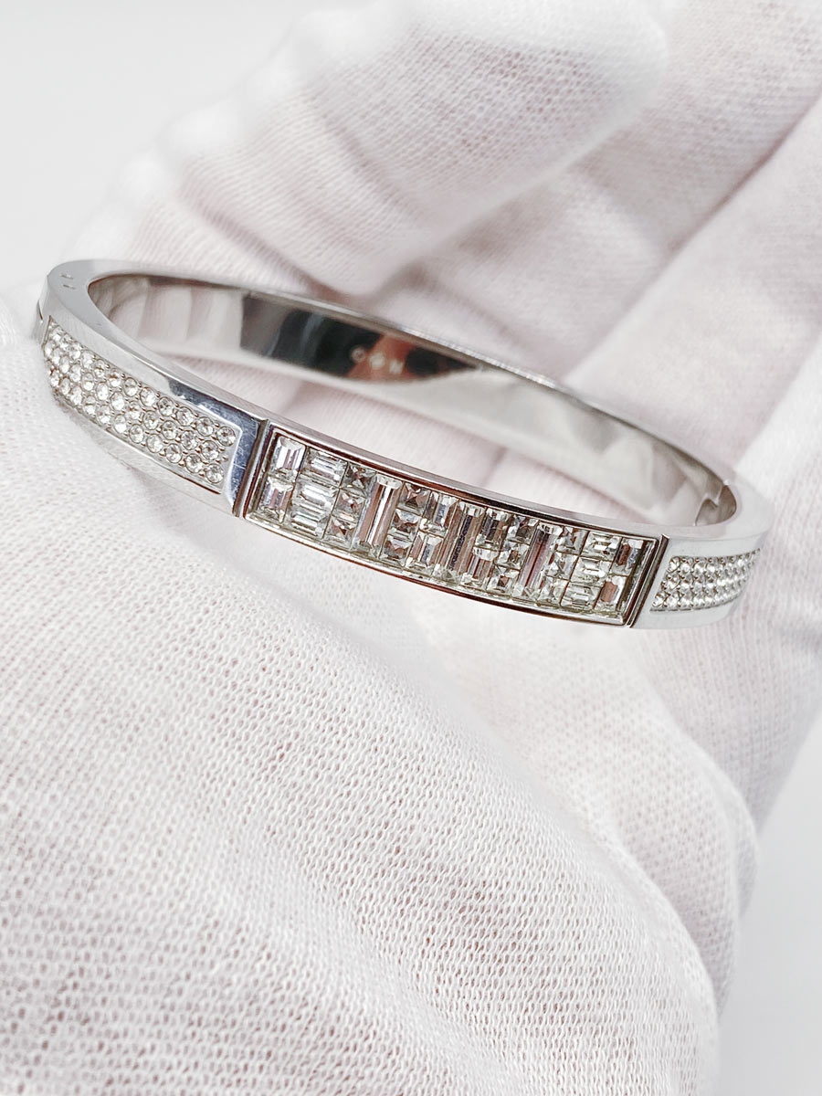 Bracciale rigido in acciaio inox con cristalli pavé Swarovski, dal design elegante e luminoso. Usato in ottime condizioni, senza graffi o segni visibili. Taglia M, perfetto da indossare da solo o abbinato ad altri gioielli. Ideale come regalo o per aggiungere un tocco di brillantezza a qualsiasi outfit.