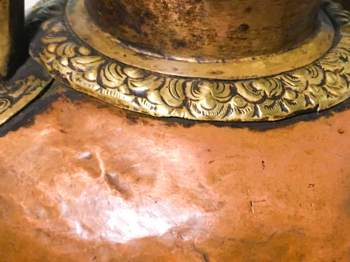 Brocca teiera antica in rame e ottone decorata e cesellata del XVIII-XIX secolo, sicuro manca il piccolo coperchio ma senza inficiare sulla bellezza. Decori molto belli