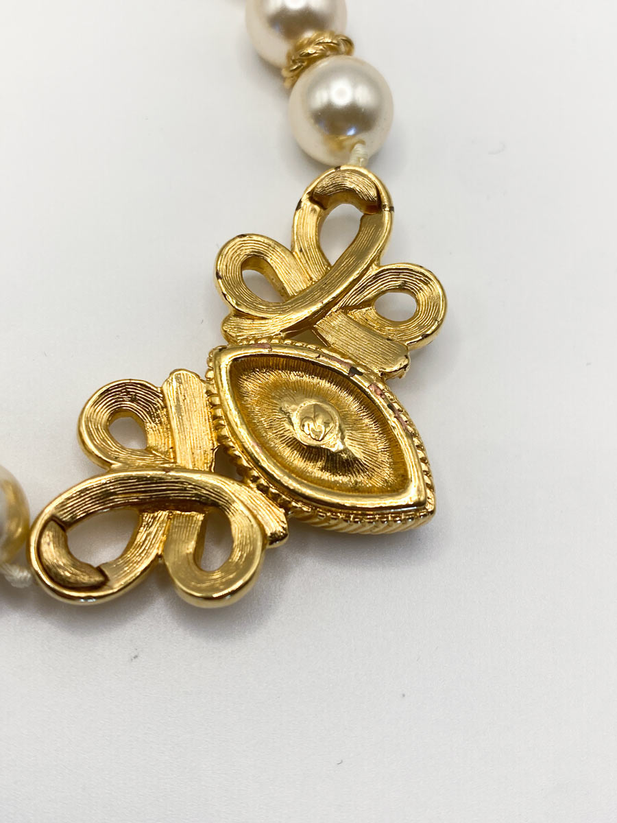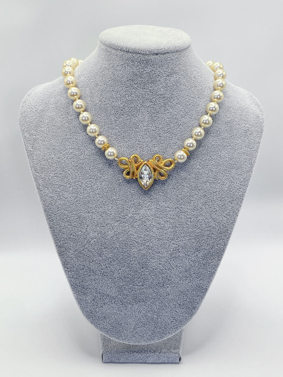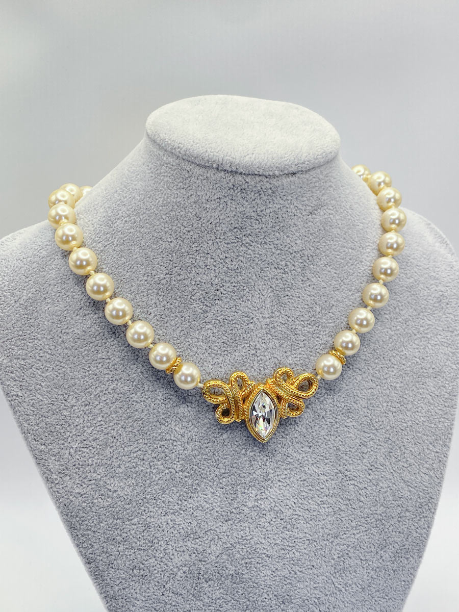 Collana girocollo Swarovski vintage, probabilmente anni ’80, riconducibile alla linea Savvy, con perle classiche Swarovski e cristallo trasparente. Elegante e raffinata, presenta un design senza tempo, ideale per occasioni speciali e look ricercati.