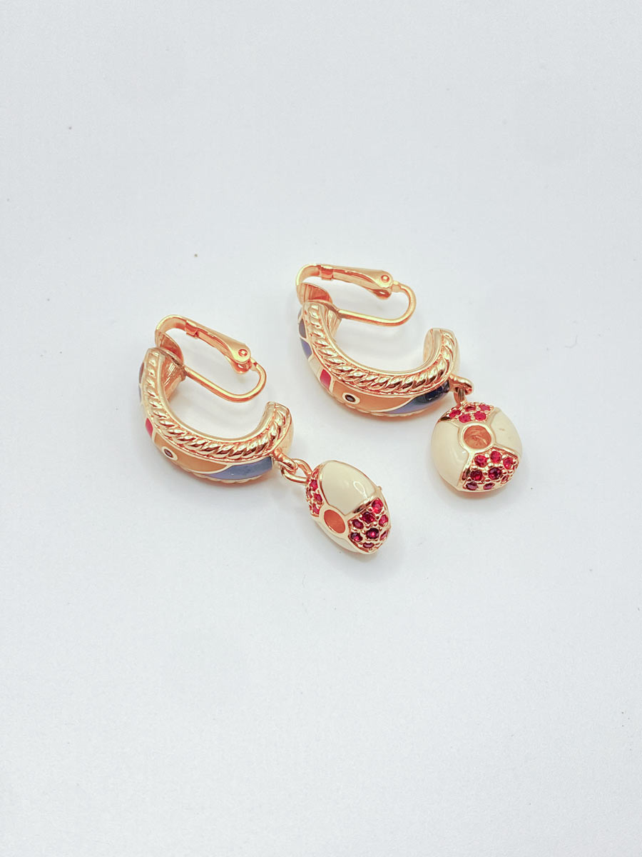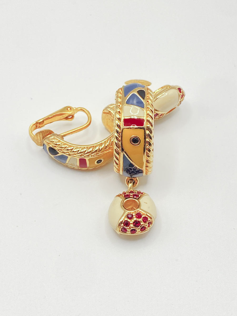 Originali orecchini a cerchio Swarovski in finitura dorata, dal design distintivo e ricercato. La struttura presenta inserti in smalto nei toni del blu, rosso e nero, arricchiti da dettagli decorativi geometrici.
