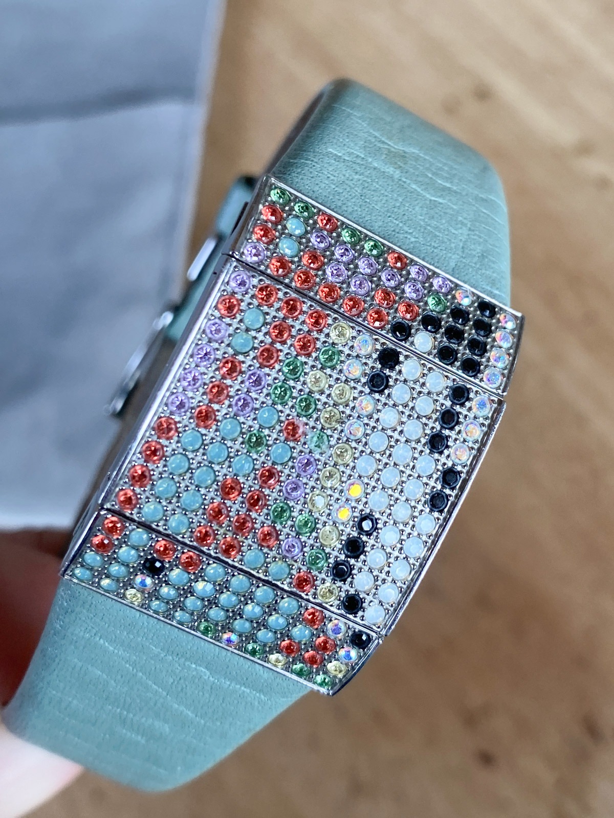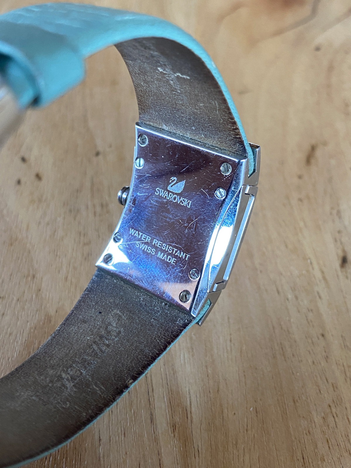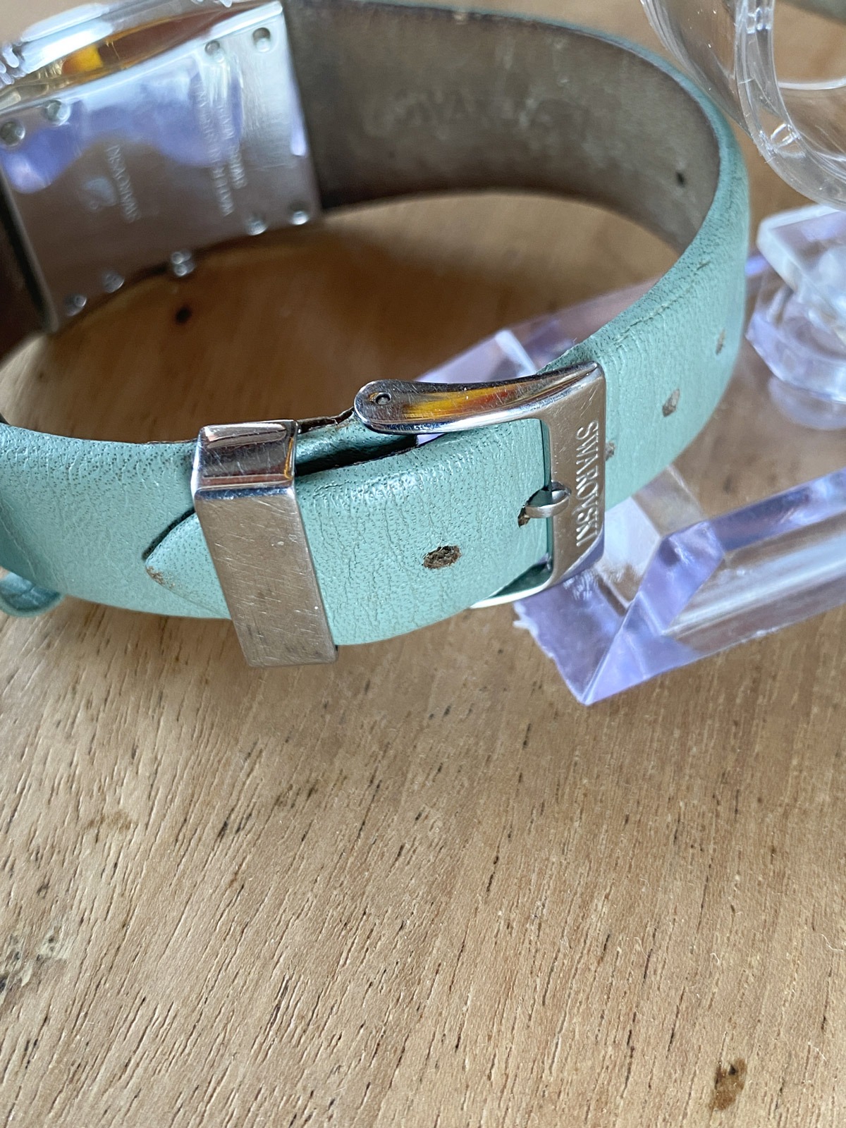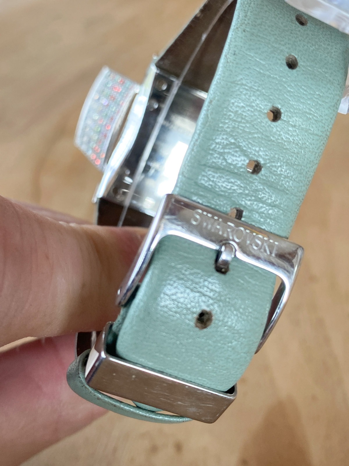 Fantastico orologio Swarovski, usato in buone condizioni, cinturino in pelle celeste non nuovissimo ma in condizioni ancora buone per l’utilizzo normale. Particolarità della sua chiusura della cassa con coperchio con cristalli multicolore che lo rende anche un bracciale. Funzionante perfettamente e batteria nuova gennaio 2026.