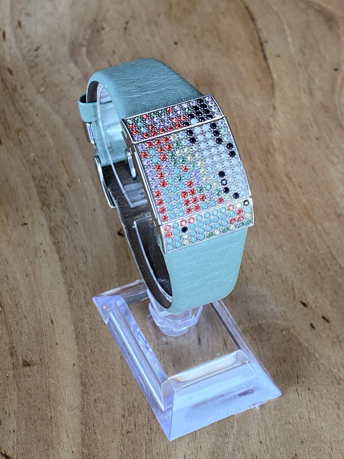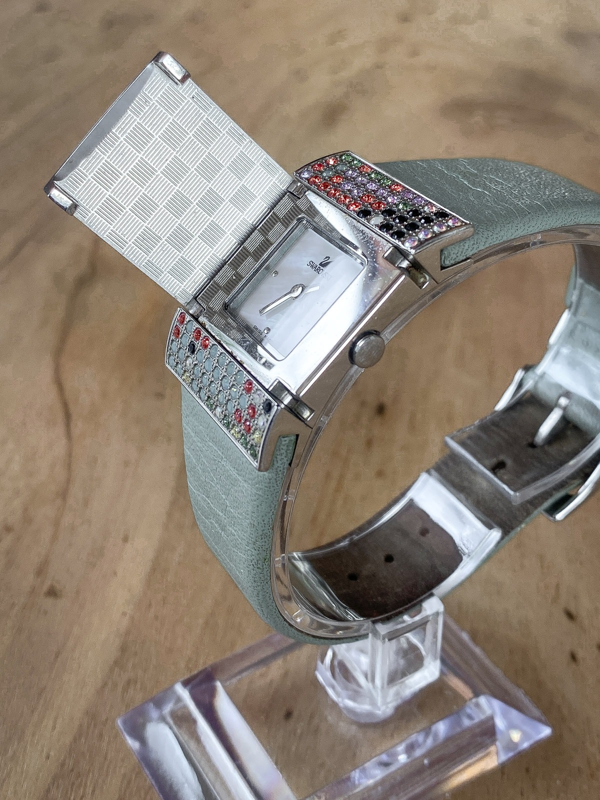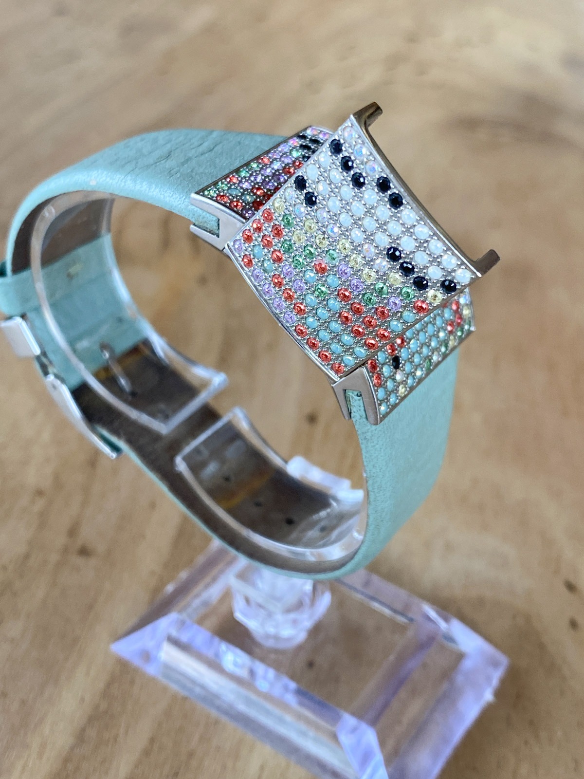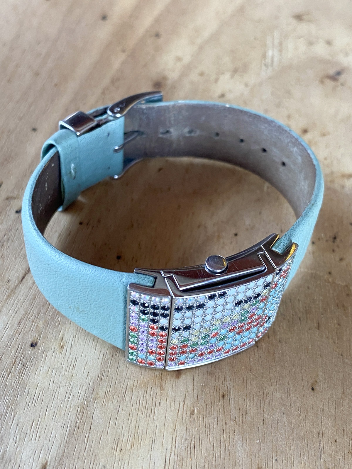 Fantastico orologio Swarovski, usato in buone condizioni, cinturino in pelle celeste non nuovissimo ma in condizioni ancora buone per l’utilizzo normale. Particolarità della sua chiusura della cassa con coperchio con cristalli multicolore che lo rende anche un bracciale. Funzionante perfettamente e batteria nuova gennaio 2026.