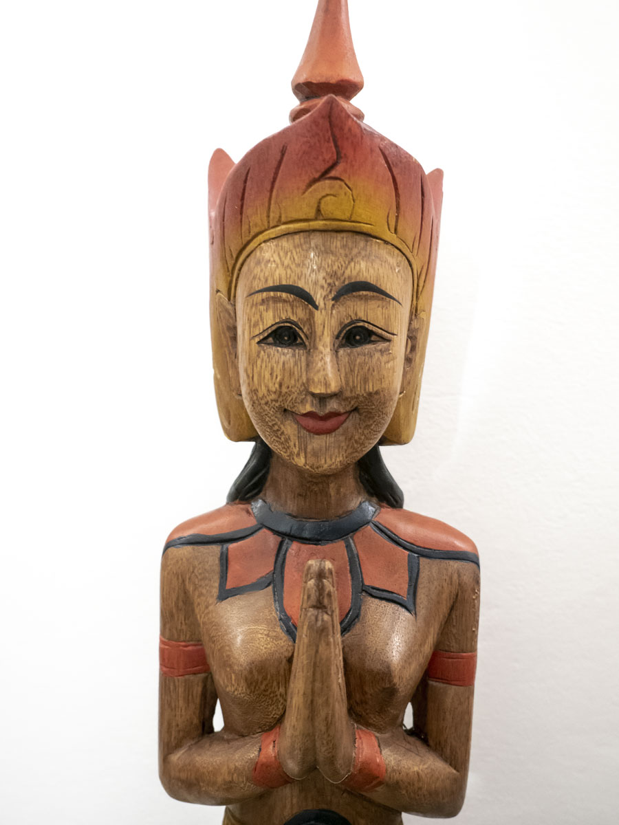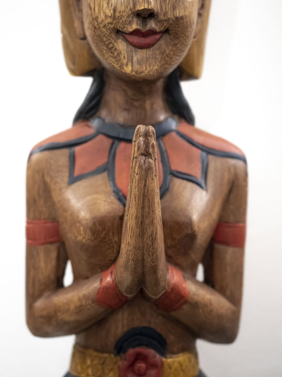 Scultura in legno donna Thailandia classico saluto, policroma, probabile periodo mid century.