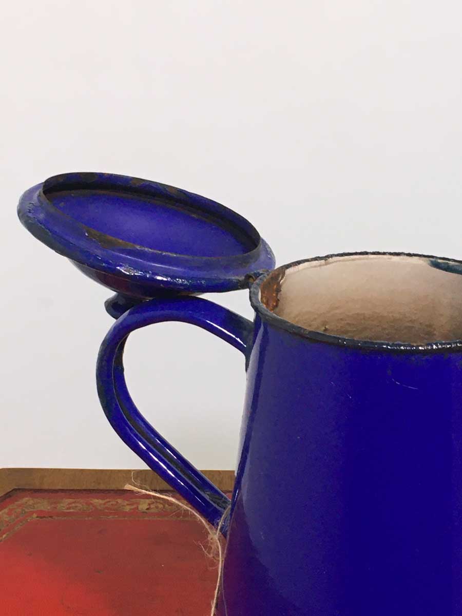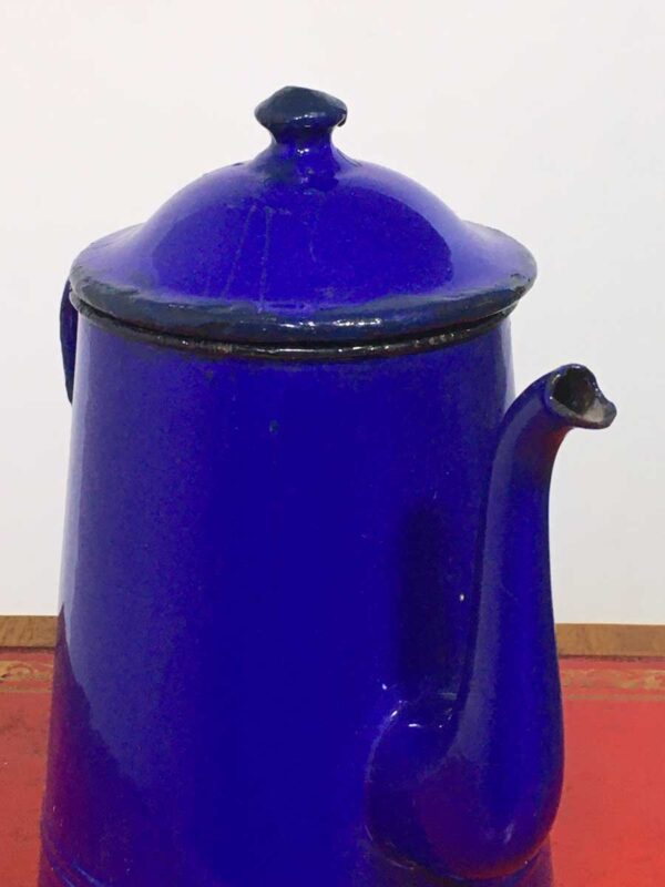 Teiera in metallo smaltata blu della famosa marca “2 leoni”, vintage anni ’40-’50. In discrete condizioni considerando che questi tipi di metalli di questa epoca presentano molte imperfezioni dovute al declino dello smalto.