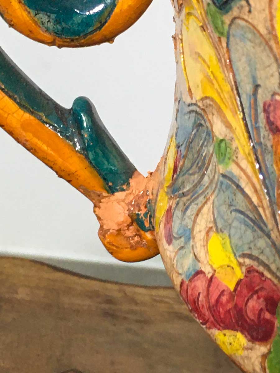 Vaso anfora centrotavola o porta frutta biansato in terracotta dipinto e decorato in stile floreale, possibile manifattura Faenza. Il vaso è probabilmente realizzato con la tecnica dell’ingobbio e della cristallina.